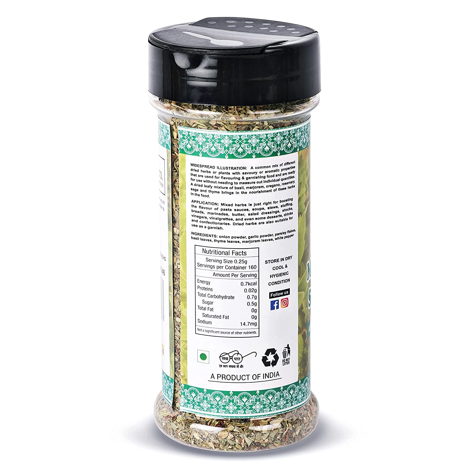 A common mix of different dried herbs or plants with savoury or aromatic properties that are used for flavouring & garnishing food and are ready for use without needing to measure out individual quantities. A dried leafy mixture of basil, marjoram, oregano, rosemary, sage and thyme brings in the nourishment of these herbs in the food. Mixed herbs is just right for boosting the flavour of pasta sauces, soups, stews, stuffing, breads, marinades, butter, salad dressings, stocks, vinegars, vinaigrettes, and even some desserts, drinks and confectionaries.